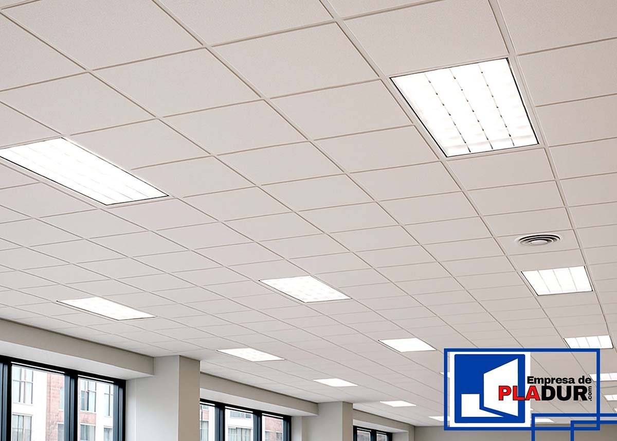 El falso techo acústico suele estar compuesto por paneles o placas desmontables con un grosor de 15 y 22 mm siendo lo más habitual. Estas placas se instalan sobre una estructura metálica (perfilería T15 o T24) permitiendo fácil acceso al forjado facilitando la gestión de instalaciones como aire acondicionado, iluminación, cableado, etc.